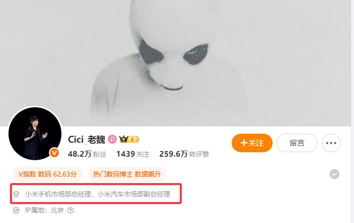 查看魏思琪社交媒体账号,认证信息已显示为“小米手机市场部总经理,小米汽车市场部副总经理”。