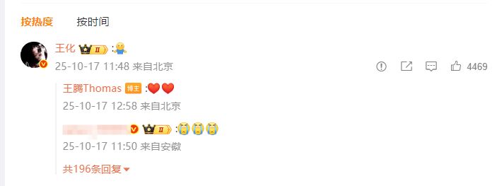 随后,小米集团公关部总经理王化在该条博文评论区回复“拥抱”表情。王腾也回复比心表情。