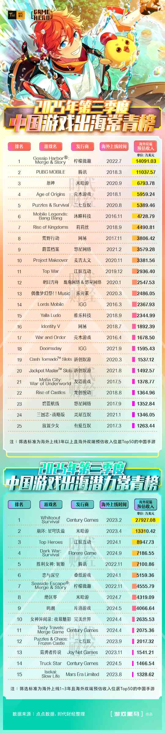 7款手游海外月均收入破亿元 据时代财经统计,此次入围《出海常青榜》的25款手游2025年第三季海外双端预估收入累计约为9.08亿美元,以中国外汇交易中心10月13日14:50披露的人民币兑美元成交价7.1309计算,约合人民币64.78亿元;其中7款手游海外双端月均预估收入超过人民币1亿元。 从游戏企业角度来看,悠星网络旗下游戏入围最多,达到3款;网易(NTES;09999.HK)、神州泰岳(300002.SZ)旗下壳木游戏、IGG(00799.HK)、新创娱游各有2款游戏入围,呈现出中小厂商与大厂并肩出海、各显神通的格局。 具体来看,位居前三的是《Gossip Harbor》《PUBG MOBILE》《原神》3款出海热门手游,今年第三季度海外双端预估收入分别达到1.41亿美元(约为10.05亿元)、1.1亿美元(约为7.87亿元)、6793.78万美元(约为4.84亿元)。 《Gossip Harbor》是柠檬微趣旗下2022年7月在海外上线的一款女性向剧情合成手游,上线仅三年首次入榜便登顶榜首。自上线以来,该游戏凭借强剧情驱动与高频内容运营,在海外市场取得了稳定的成绩,并在今年三季度迎来三周年庆典,推出了相关庆祝活动,进一步提升了玩家的参与度和活跃度,继续维持其在合成品类中的领先地位。 而作为腾讯(00700.HK)旗下的“吃鸡”手游国际服,《PUBG MOBILE》上线七年多仍稳居全球大逃杀类射击手游之首,今年三季度先后开启3.9版本和4.0版本,推出变形金刚联动、夏日大混战、“绯月异变”、幽灵派对排位联动等主题玩法,进一步带动老用户回流和付费双涨。 米哈游旗下ARPG手游《原神》在今年三季度迎来了五周年庆典,并凭借周年庆版本的更新,推出全新地图、新角色、抽卡与圣遗物保底改革以及大量减负优化,实现爆发,排名稳居《出海常青榜》第三位。 其后,《Age of Origins》《Puzzles & Survival》2款出海热门手游三季度海外双端预估收入均超过5000万美元,分别为5959.24万美元(约为4.25亿元)、5389.46万美元(约为3.84亿元),稳居《出海常青榜》前五。 壳木游戏旗下末日题材策略(SLG)塔防手游《Age of Origins》在今年三季度依然保持了高频率的版本更新节奏,不断丰富全新Roguelite(肉鸽)式3D战争策略玩法,引入“战术指令卡”系统,强化即时策略体验,新增“高地工事”“洼地伏击”两种可占领地形,同时通过荣誉排名与6星军官系统进一步拉大长线养成深度,并针对采集、治疗等痛点做了减负优化。 三七互娱(002555.SZ)旗下融合休闲三消玩法的SLG手游《Puzzles & Survival》在今年三季度也迎来了五周年庆典,上线了“5th Anniversary”主题庆祝活动,包括限时海滨嘉年华和全新剧情任务,玩家可与角色Alexander一起参与狂欢派对。8月底,《Puzzles & Survival》还推出七夕文化主题版本,将乞巧文化代表性符号“七娘盘”作为核心元素植入,玩家参与限时节日活动即可将其作为藏品收入囊中,以沉浸式体验让全球用户感受东方乞巧文化魅力。 三七互娱集团董事、高级副总裁程琳对时代财经表示,三七互娱一直在走多元化和精品化的路线,所以题材包括玩法都在不断迭代。此外,更关键的还是对于用户需求的精准把握;同时,潜移默化地进行了很多中国文化元素植入,既增强了用户粘性,也让海外玩家对中国游戏有了更深层的认知。此外,AI技术对游戏出海也有极大的帮助。 出海潜力常青再扩容 在上述25款2025年第三季度出海常青游戏之外,时代财经在统计过程中发现,已有不少出海游戏展现出成为常青的潜力。它们普遍在海外上线超过一年之后,依旧维持着稳定的流水表现,能在激烈的市场竞争之中,持续跻身海外双端预估收入Top50的中国手游行列。 据时代财经统计,今年第三季度共有15款游戏进入《出海潜力常青榜》,数量较上半年增加1款、较一季度增加3款。其中,世纪华通(002602.SZ)旗下Century Games表现亮眼,有3款游戏入围;米哈游旗下有2款游戏入围;腾讯、三七互娱、完美世界(002624.SZ)、叠纸游戏、库洛游戏、江娱互动、Florere Game、柠檬微趣、Joy Net Games等厂商各有1款游戏入围。 具体来看,Century Games旗下4X策略手游《Whiteout Survival》海外收入依然遥遥领先,今年第三季度海外双端预估收入约达2.79亿美元(约为19.91亿元)。今年三季度,《Whiteout Survival》进行了多次内容更新,先后上线了王国移民、霜龙霸主、除雪小分队等活动,新增专家系统、强盛荣耀系统、尊享特权等功能,使其在全球市场的热度持续上涨。 其后,《崩坏:星穹铁道》《Top Heroes》两款游戏三季度表现依然稳定,海外双端预估收入分别为1.33亿美元(约为9.49亿元)、8947.73万美元(约为6.38亿元),稳居《出海潜力常青榜》前三。 今年三季度,米哈游旗下3D角色扮演类回合制策略手游《崩坏:星穹铁道》实现“月更”,三次更新均围绕新角色、系统优化与玩家体验提升展开,其中9月的3.6版本因SP角色与剧情回放功能尤为受关注;而江娱互动旗下策略手游《Top Heroes》今年三季度更新17个版本,包括开启公会里程碑活动、上线全新玩法“矿脉征服”、全新友情羁绊和御兽守护系统等。 此外,《Dark War:Survival》《胜利女神:妮姬》《恋与深空》3款出海热门手游三季度海外双端预估收入均超过5000万美元,分别为7186.55万美元(约为5.12亿元)、7100.86万美元(约为5.06亿元)、5159.36万美元(约为3.68亿元)。 值得注意的是,除了《Whiteout Survival》外,Century Games旗下“环球美食+合并经营”休闲手游《Tasty Travels: Merge Game》和“三消+卡车改装”轻度休闲手游《Tru