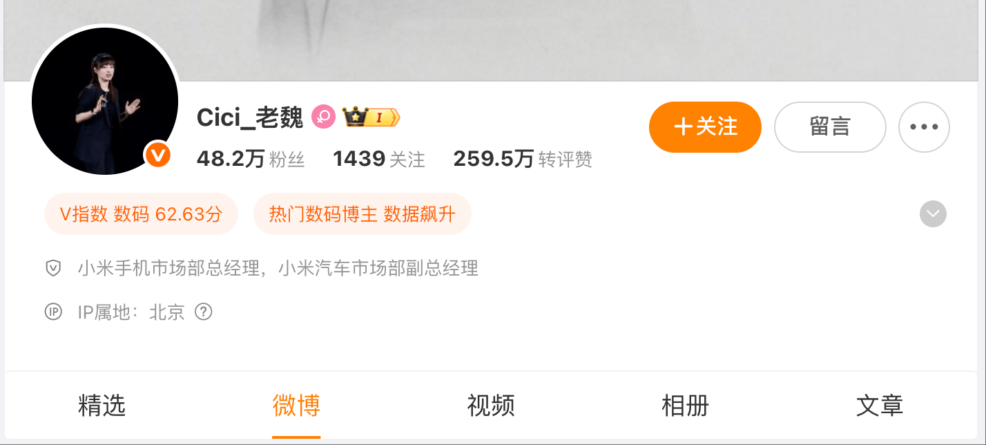 查询发现,魏思琪的微博账号“Cici_老魏”的认证信息为小米手机市场部总经理,小米汽车市场部副总经理。