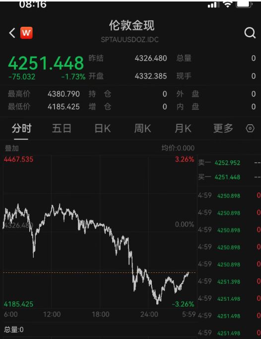 截至收盘,现货黄金报4251.45美元/盎司,跌1.73%。