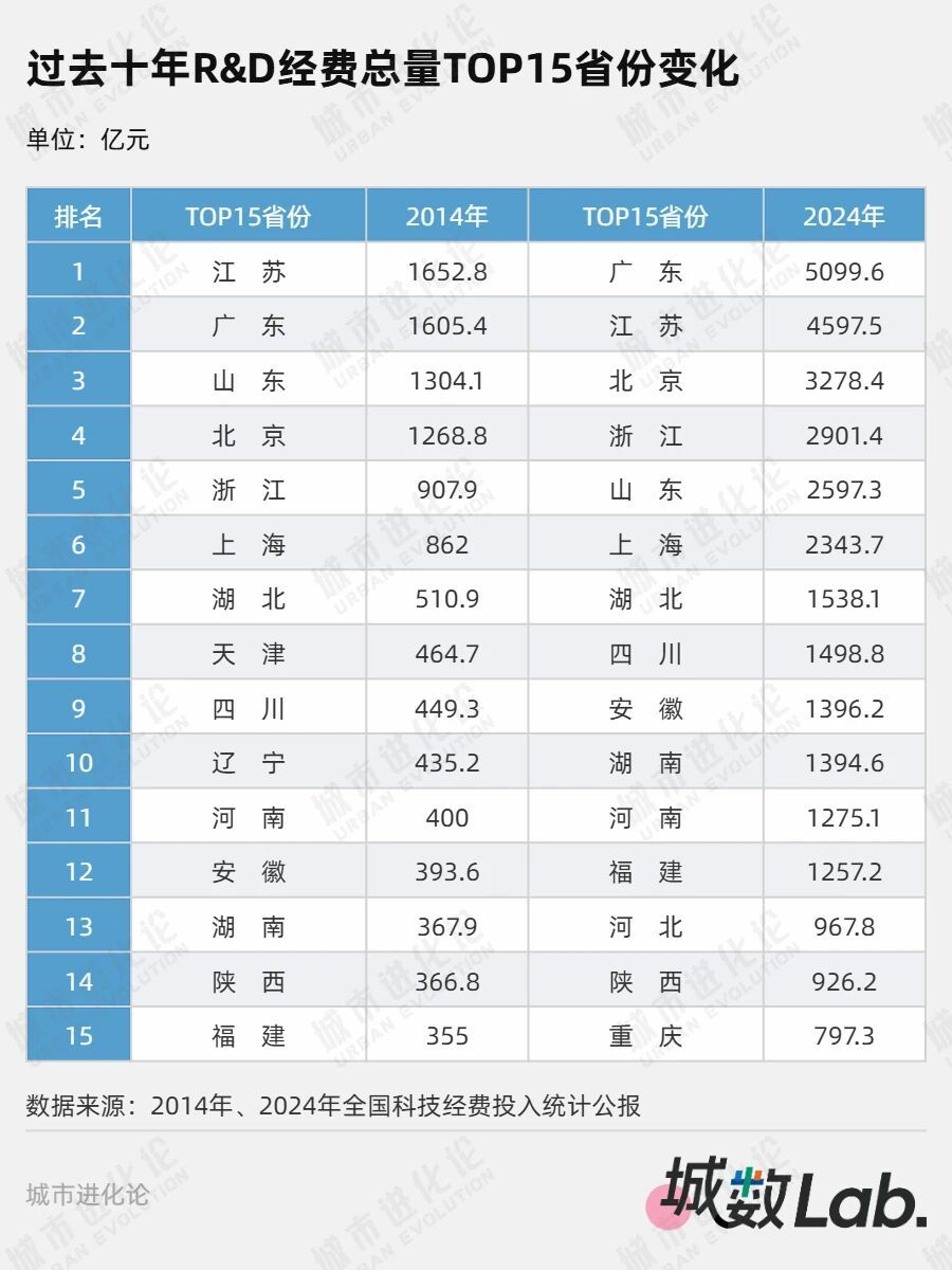 如果说经费规模代表总体实力,投入强度则更能反映当地的重视程度与决心。这方面,安徽表现亮眼——2024年R&D投入强度达2.76%,排名紧随经济强省江苏、浙江之后,也是7个超全国平均线(2.69%)省份中的中西部“独苗”。 进一步拉长时间线,看看“黑马”安徽有多猛?数据显示,过去十年间,安徽R&D经费规模与投入强度先后反超多个省份实现位次跃升,势头强劲。