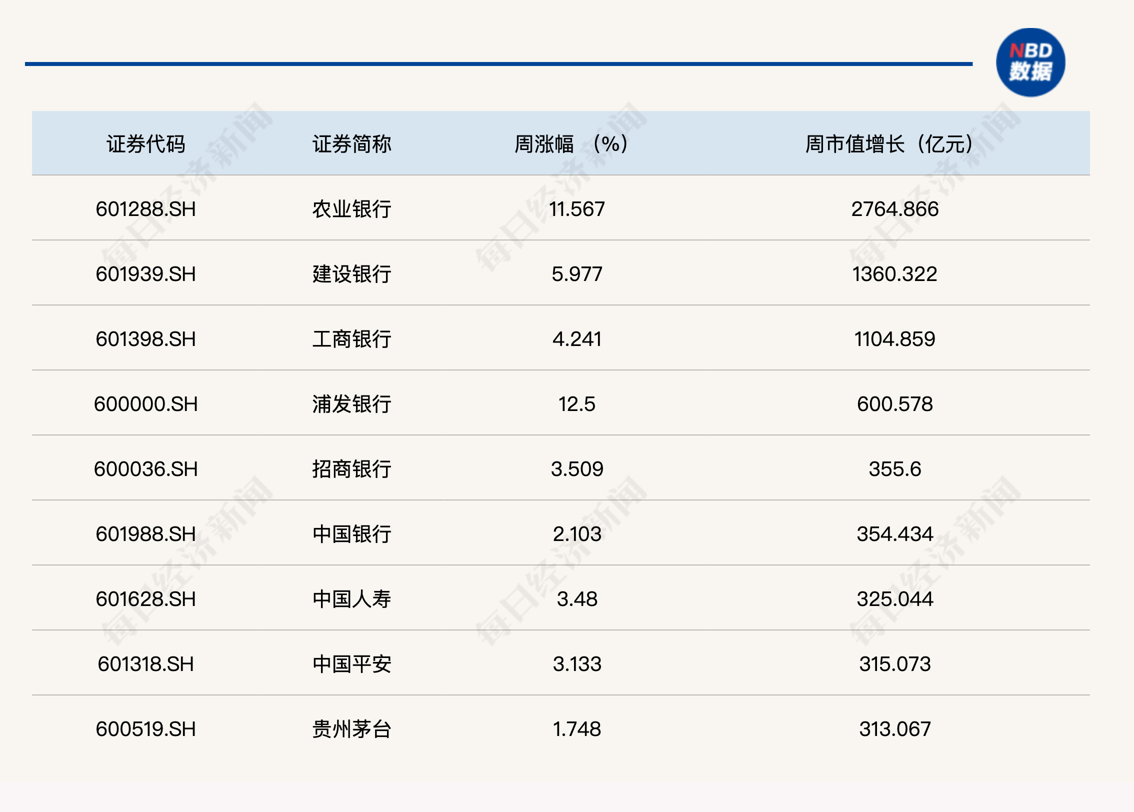每经品牌100指数本周仅有不到四成个股上涨,其中银行、保险以及白酒等防御性板块表现较强,其中浦发银行、农业银行、中国人保、中国银行以及建设银行周涨幅超过5%。 周市值增长方面,农业银行周市值增长高达2764.87亿元,建设银行和工商银行周市值增长也分别达到1360.32亿元和1104.86亿元。