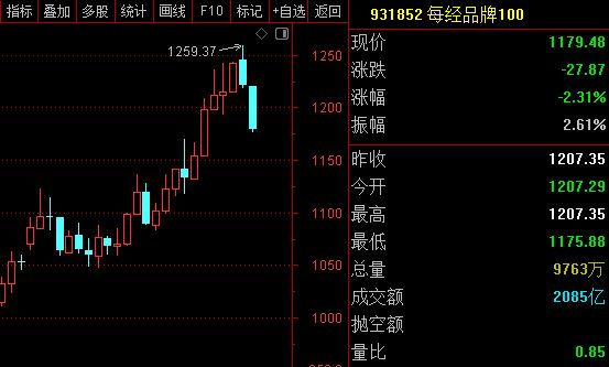 每经记者|刘明涛 每经编辑|肖芮冬 本周市场出现宽幅震荡整理,在科技股集体大幅回调的背景下,创业板、科创板以及恒生科技指数周跌幅均超过5%,每经品牌100指数周跌幅也达到3.46%,以1179.48点报收,退守至1200点之下。 3只成分股周市值增长超千亿元本周大盘低开随后冲高回落,三大指数周K线均收跌,沪指3900点得而复失。截至10月17日收盘,上证指数周跌1.47%,深证成指周跌4.99%,创业板指周跌5.71%,科创50指数周跌6.16%;每经品牌100指数在恒生科技指数下跌的拖累下,周跌3.46%,以1179.48点报收。