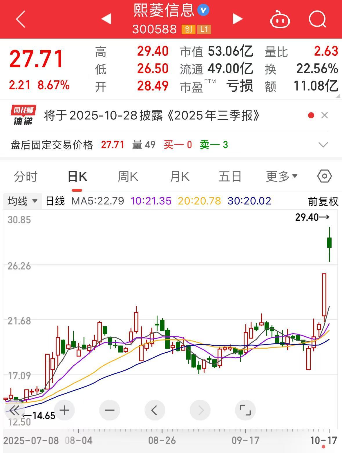 盘面上,截至10月17日收盘,熙菱信息股价大涨超8%,报27.71元,市值53.06亿元。值得注意的是,自8月19日岳亚梅被立案调查并采取留置措施以来,熙菱信息股价反而涨了34.32%。