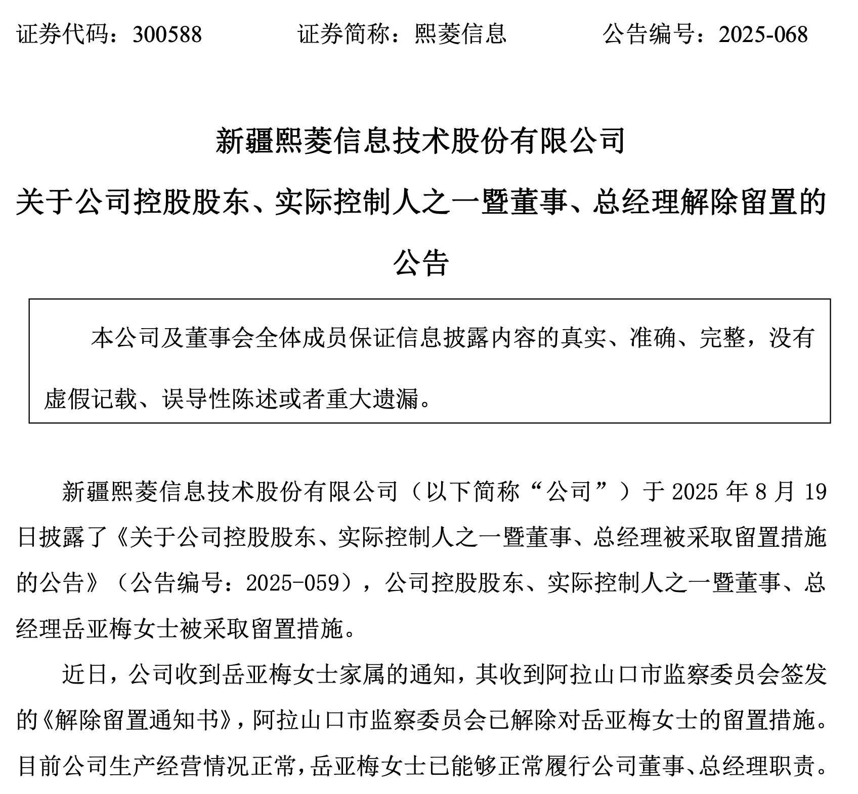 每经编辑|黄胜 10月19日,熙菱信息(300588.SZ)公告称,公司收到控股股东、实际控制人之一暨董事、总经理岳亚梅的家属的通知,其收到阿拉山口市监察委员会签发的《解除留置通知书》,阿拉山口市监察委员会已解除对岳亚梅的留置措施。目前公司生产经营情况正常,岳亚梅已能够正常履行公司董事、总经理职责。