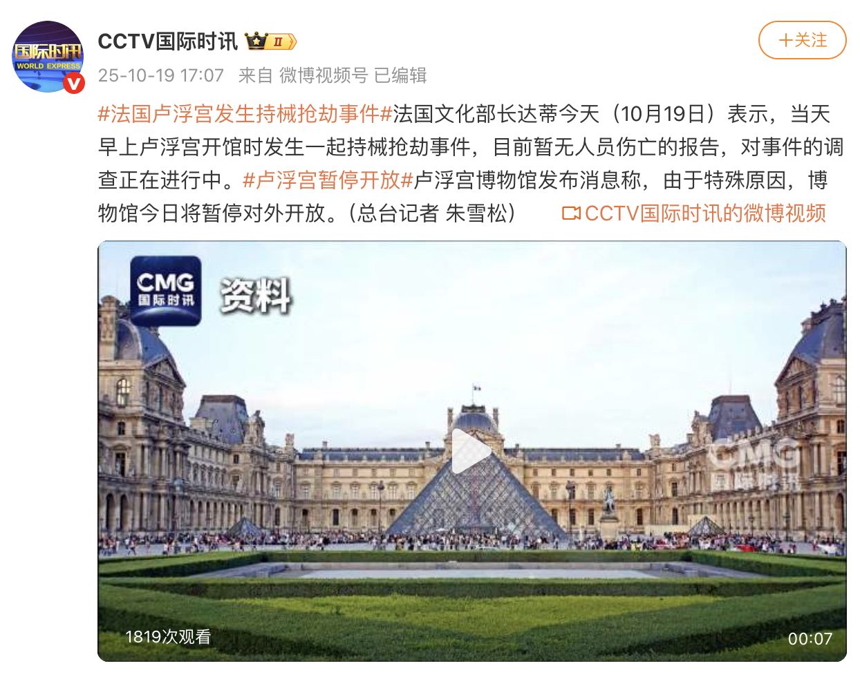 央视新闻消息,法国文化部长达蒂当地时间19日早间表示,当天早上巴黎卢浮宫开馆时发生一起持械抢劫事件。暂无人员受伤报告。目前调查正在进行中。 卢浮宫博物馆发布消息称,由于特殊原因,博物馆当天将暂停对外开放。