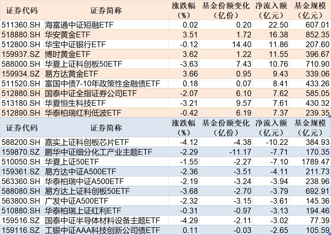 每经记者|叶峰 每经编辑|肖芮冬 上周五市场全天震荡调整,创业板指、科创50指数跌超3%。盘面上,燃气板块逆势上涨,银行板块表现较强,港口航运板块局部强势。下跌方面,光伏、锂电池板块跌幅居前。 Wind数据显示,在10月17日非货币ETF市场中,海富通中证短融ETF基金份额增加0.2亿份,净流入额为22.5亿元;华安黄金ETF基金份额增加1.72亿份,净流入额为16.38亿元;华宝中证银行ETF基金份额增加14.4亿份,净流入额为11.86亿元。