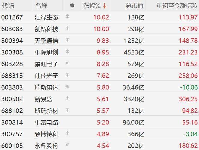 格隆汇10月20日|A股市场CPO概念表现强势,其中,汇绿生态、剑桥科技涨停,天孚通信涨超9%,中际旭创(300308)、景旺电子(603228)涨超8%,仕佳光子涨超7%,瑞斯康达(603803)、新易盛(300502)、斯瑞新材、中富电路涨超5%。