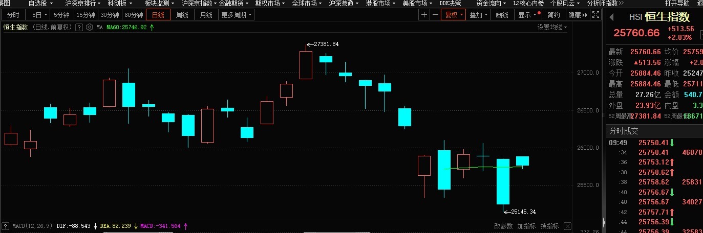 每经编辑|袁东 今日(10月20日),港股高开。 截至发稿,恒生指数报25760.66点,上涨513.56点,涨幅达2.03%。