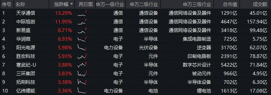 成份股方面,光模块三巨头携手士兰微(600460)荣登A股吸金榜前四,天孚通信涨超13%、中际旭创涨逾11%,新易盛涨超8%,华润微、阳光电源(300274)、胜宏科技(300476)等个股大幅跟涨。 图:双创龙头ETF(588330)标的指数涨幅前10大成份股