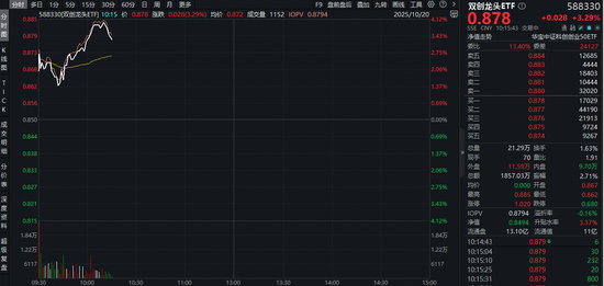 今日(10月20日)创业板+科创板携手反攻,覆盖两个板块高成长龙头的硬科技宽基――双创龙头ETF(588330)场内涨幅一度上探4%,现涨3.29%,盘中收复5日均线。