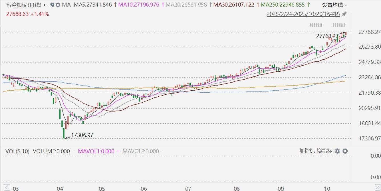 格隆汇10月20日|台湾加权指数盘中一度涨1.71%报27768.27点,再创历史新高;最终收涨1.41%报27688.63点,再创收盘历史新高。台湾加权指数年内累涨20.2%。