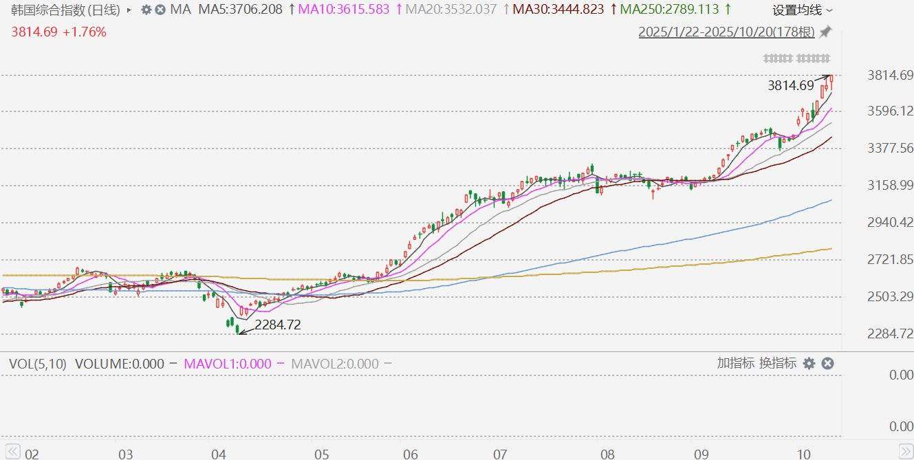 格隆汇10月20日|韩国综合指数收涨1.76%报3814.69点,收在历史最高位;韩国综合指数年内累涨58.98%。