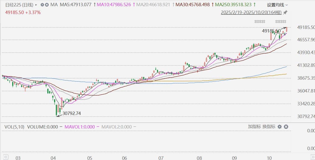 格隆汇10月20日|高市早苗出任首相之路几成定局,日股大涨。日经225指数收涨3.37%报49185.5点,收在历史最高位。日经225指数年内累涨23.29%。