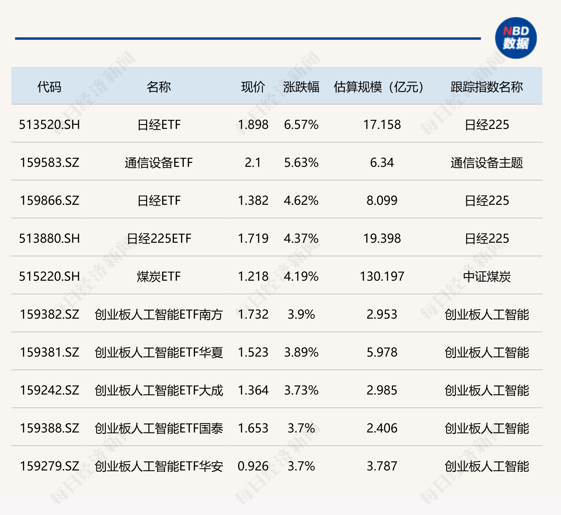 每经记者|叶峰 每经编辑|彭水萍 市场冲高回落,创业板指一度涨超3%。盘面上,市场热点轮番活跃,算力硬件股表现活跃,煤炭板块持续走强。下跌方面,有色金属出现调整。 ETF涨跌幅方面,日经ETF涨超6%,通信设备ETF涨超5%。