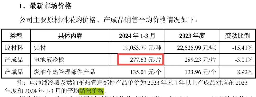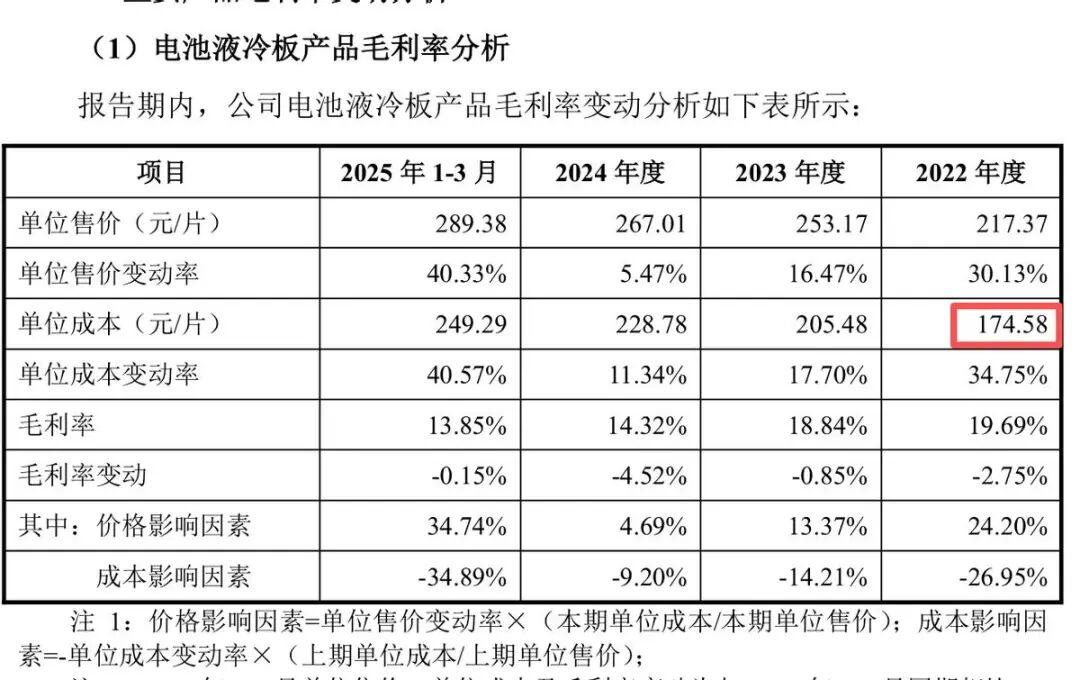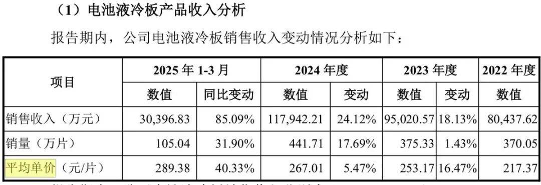 (截图来自企查查) 不过,上海兰钧在招股书中被比照关联方进行披露。瑞浦兰钧能源股份有限公司持有永青科技47.85%的股份、持有上海兰钧71%的股份,永青科技持有纳百川10.80%的股份,基于谨慎性原则,纳百川将上海兰钧列为关联方,并披露了公司与其产生的关联交易。 其次是销售数据方面,纳百川各版本招股书以及问询回复披露的内容有出入。 注册稿披露,2025年1-3月,纳百川电池液冷板单价为289.38元/片,同比变动40.33%;但二轮问询回复披露,2024年1-3月纳百川电池液冷板销售价格为277.63元/片,同比变动数据相差甚远。