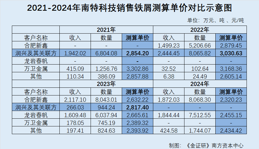经对比南特科技披露的向其他三家铸件供应商采购单价,2021-2024年,南特科技向联合精密采购铸件的单价,均低于其他三家铸件供应商。 而据联合精密2022年6月20日招股书,2019-2021年,联合精密向南特科技采购单价分别为5,995.22元/吨、6,131.85元/吨、不适用;同期,联合精密向同类铸件其他供应商采购均价分别为6,313.12元/吨、6,261.3元/吨、7,076.89元/吨。 可见,联合精密申报上市期间,联合精密向南特科技采购单价,或低于同类铸件其他供应商。 另外,南特科技与联合精密上下游或现重叠。 据2025年8月27日招股书,联合精密系南特科技选取的可比公司之一。南特科技与联合精密下游客户较为重叠,主要为美的集团、格力等压缩机生产商,双方主营业务领域较为相似,均于华南、华东设立生产基地。 并且,经对比南特科技2025年8月27日招股书及联合精密2022年6月20日招股书,南特科技和联合精密申报上市期间,二者存在相同的主要客户及主要供应商。 总的来看,申报期间,南特科技曾存在回函不符的主要客户,主要系格力,2022-2023年回函差异额合计均超两千万元。另外,南特科技与可比公司联合精密业务相似,且上下游合作方或存重叠,联合精密还是南特科技格力指定的铸件供应商。而南特科技与联合精密在各自上市申报的文件中,披露的与对方的合作时间或现“两个版本”。 二、向贸易商润兴采购废钢并销售废料遭问询,“低价”采购废钢影响净利润逾百万元 2024年3月15日,《关于加强上市公司监管的意见(试行)》提出,要提高穿透式监管能力和水平,强化对上市公司重要往来主体等信息的收集串并,提升发现能力。坚持信息披露、公司治理“双轮驱动”。 申报期间,南特科技向润兴及其关联方采购废钢并销售废料遭“两连问”。而研究发现,2023-2024年,南特科技向润兴及其关联方“低价”采购废钢,对净利润的影响金额分别为-121.92万元、-57.47万元。 2.1 向贸易商润兴采购废钢并销售废料遭问询,称含铬边角料难全部回炉使用而存少量对外销售情形 需要说明的是,废料主要系南特科技在精密加工过程中对铸件切削打磨产生的铁屑(边角料)。 据2025年8月27日招股书,2022-2024年,中山市润兴再生资源回收有限公司(以下简称“润兴”)及其关联方分别是南特科技的第三大、第二大、第二大供应商,南特科技向其采购废钢。并且,2022年,润兴及其关联方是南特科技第四大客户,南特科技向其销售废料。 可见,申报期间,南特科技向润兴及其关联方采购废钢、销售废料。 此外,据2025年4月23日首轮问询回复,贸易商润兴成立于2018年1月19日,南特科技与润兴于2018年开始合作。 在此情形下,南特科技与润兴及其关联方存在销售、采购的情形,遭“两连问”。 据2025年7月15日二轮问询回复,南特科技存在向润兴及其关联方采购废钢的同时销售废料的情形。基于此,北交所要求南特科技进一步说明必要性。 对此,南特科技称,华南基地产生的废料主要用于回炉使用,但对于滑片加工产生的含铬边角料难以全部回炉使用,因此,华南基地亦存在少量对外销售废料的情况。 2.2 产生的边角料将投入熔炉重复利用,却称不存在对外销售回炉料情形 据2025年7月15日二轮问询回复,生产性废料主要包括精密加工产生的铁屑、铸造生产产生的回炉料及生产过程中的不良品。 并且,南特科技称,回炉料为铸造的生产过程产生的边角料,华南基地具备铸造产能,所以产生回炉料,华东基地不具备铸造产能,不产生回炉料。边角料归集于边角料池中用于回炉(所以行业内称为“回炉料”)。 据2025年4月23日首轮问询回复,铸造的生产过程为向熔炉投入废钢、合金及其他材料熔炼为铁水,将铁水流入模具成型为铸件,在此过程会产生边角料,产生的边角料将投入熔炉重复利用。 值得一提的是,据2025年7月15日二轮问询回复,南特科技称报告期内,产生的回炉料均用于投入铸造厂进行回炉生产,不存在对外销售回炉料的情况。 2.3 废料部分自用、部分对外销售合理性遭问询,南特科技参照废钢价格出售废料 据2025年4月23日首轮问询回复,南特科技存在废料部分自用、部分对外销售的情况。基于此,北交所要求南特科技说明原因及商业合理性。 对此,南特科技称,报告期内,废料部分自用、部分对外销售,主要系不同生产基地产能情况不同所致。其中,2021-2024年华东基地尚未具备铸件产能,因此废料无法进行回炉生产,而在当地直接出售。 前述提及,废料主要系在精密加工过程中对铸件切削打磨产生的铁屑(边角料)。 据2025年8月27日招股书,在华东基地,由于铸造产能尚未建设完毕,南特科技加工过程中产出铁屑(边角料)及不良品无法回炉自用,主要参照废钢价格进行出售。 需要指出的是,南特科技以废钢价格销售废料的对手方包括润兴及其关联方。 据2025年7月15日二轮问询回复,由于华东基地铸造产能尚未建设完毕,导致自有铸件产能不足、加工过程产出的铁屑及不良品无法回炉自用,因此存在南特科技向客户购买铸件以及向废钢供应商(如润兴及其关联方)出售铁屑及不良品的情形。 在此背景下,南特科技与润兴及其关联方的交易价格,或值得关注。 2.4 2023-2024年向润兴低价采购对净利润的影响金额,分别为-121.92万元、-57.47万元 据2025年4月23日首轮问询回复,南特科技披露报告期内六家废钢供应商采购金额、占比及单价变动情况。其中,2021-2024年,南特