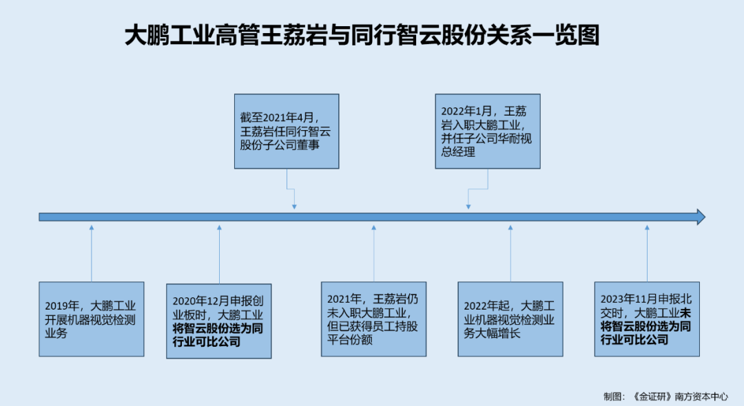 《金证研》南方资本中心 池恩DL/作者 易溪 南江 映蔚/风控 2025年8月,关于深入实施“人工智能+”行动的意见发布,旨在推动人工智能与经济社会各行业各领域广泛深度融合。此番申报北交所的哈尔滨岛田大鹏工业股份有限公司(以下简称“大鹏工业”)系工业精密清洗领域专用智能装备生产商。其中,2024年,大鹏工业机器视觉检测设备业务仅1,258.72万元,占主营业务收入的比例为4.76%。 回溯历史,2019年,大鹏工业布局机器视觉检测设备业务。其中,大鹏工业的子公司华耐视(哈尔滨)智能检测科技有限公司(以下简称“华耐视”)主要从事机器视觉检测业务,王荔岩系华耐视的总经理。而王荔岩或未入职先受让员工持股平台份额,入职当年,大鹏工业视觉检测设备业务收入大增,且其老东家系大鹏工业前次申报的可比公司。而2025年8月,王荔岩被认定为核心员工之一,上市前夕获本次发行参与战略配售。另外,大鹏工业因存在超产遭遭问询、建设项目或上演“先上车后补票”异象或值得关注。 一、子公司总经理前东家系前次申报的同行,或未入职先入股员工持股平台入职当年新业务收入上涨 2025年9月4日,人力资源社会保障部办公厅发布《企业实施竞业限制合规指引》,竞业限制事项再次吸引了公众的关注。 2025年8月,大鹏工业过会次月召开的董事会议,决议将子公司总经理王荔岩等人认定为核心员工,其中并授予王荔岩参与此次发行的战略配售。研究发现,王荔岩曾于在前次申报的同行任职,其或离职不足1年即入职大鹏工业。值得注意的是,大鹏工业称王荔岩于2022年1月入职,首轮问询回复披露,2021年王荔岩即受让员工持股平台份额。 1.1 子公司总经理王荔岩被认定为核心员工之一,上市前夕获本次发行参与战略配售 据大鹏工业签署于2025年9月2日的招股说明书(以下简称“签署于2025年9月2日招股书),大鹏工业的控股子公司华耐视主要从事机器视觉检测设备研发及销售。 截至招股书签署日,王荔岩系华耐视总经理,其通过员工持股平台哈尔滨普拉特企业管理咨询有限合伙企业(以下简称“普拉特”)间接持有大鹏工业0.11%股权。 公开信息显示,2025年8月15日,大鹏工业通过北交所上市委员会审议。 据大鹏工业签署于2025年9月12日的第四届董事会第十次会议(临时会议)决议公告,2025年9月11日,大鹏工业召开第四届董事会第十次会议(临时会议)。 会议上,大鹏工业审议并通过《关于提名并拟认定核心员工的议案》、《关于公司高级管理人员及核心员工拟设立专项资产管理计划参与向不特定合格投资者公开发行股票并在北交所上市战略配售的议案》。内容主要系,鉴于大鹏工业拟申请于北交所上市,为了增强员工归属感,提高员工工作积极性,大鹏工业董事会提名王大亮、王荔岩、薛怡然、韩庆玲共4名员工为大鹏工业核心员工。 此外,大鹏工业高级管理人员、核心员工拟通过设立专项资产管理计划的方式参与本次发行战略配售。 具体来看,大鹏工业部分高级管理人员及核心员工拟通过设立专项资产管理计划的方式参与本次发行战略配售,该次配售比例不超过该次拟公开发行股票数量的10%,募集资金规模不超过本次公开发行股票数量的10%所对应的资金规模,且承诺本次配售的股票的限售期为12个月。 该次参与专项资产管理计划人员共7名,分别为李鹏堂、李俊堂、周芝彬、王大亮、王荔岩、薛怡然、韩庆玲。其中,王荔岩系“核心员工”。 需要说明的是,据签署于2025年9月2日招股书,截至招股书签署日,李鹏堂系大鹏工业的实际控制人,李鹏堂与李俊堂系兄弟关系,且为一致行动人。周芝彬系大鹏工业财务负责人及董事会秘书。 由上可知,2025年8月,大鹏工业成功过会。次月,大鹏工业召开董事会并决议将王荔岩等4人认定为核心员工,并决议大鹏工业部分高级管理人员以及核心员工通过设立专项资产管理计划的方式参与本次发行战略配售,参与人员包括王荔岩。 1.2 王荔岩于2022年1月入职,首轮问询回复披露其在2021年受让员工持股平台普拉特份额 据签署于2025年9月2日招股书,王荔岩的入职时间为2022年1月10日。 据签署日为2024年6月28日的首轮问询回复(以下简称“首轮问询回复”),2021年度,王荔岩向张伟等4名员工转出31.5万元,资金性质为“受让普拉特份额”,资金来源为自筹资金。 据市场监督管理局数据,普拉特成立于2016年3月31日。变更信息显示,2022年3月18日,张伟、郭立明、杨志超、杨福华退出普拉特,不再持股。同日,王荔岩新增成为普拉特股东。 换言之,从市场监督管理局数据及招股书信披来看,王荔岩2022年1月入职大鹏工业,同年3月从张伟等等人受让普拉特股份。而首轮问询回复披露,2021年,王荔岩向张伟等4人转出31.5万元以受让普拉特份额,令人费解。 1.3 王荔岩曾任智云股份(300097)子公司技术部部长,官宣变更信息显示其于2021年4月不再担任智云股份子公司的董事 再看王荔岩的履历情况。 截至查询日期2025年10月16日,据黑龙江科技成果和知识产权综合服务平台于2023年10月28日的公开信息,大鹏工业的总经理王荔岩曾任上市公司大连智云自动化装备股份有限公司(以下简称“智云股份”)副总经理。 据智云股份签署于2016年4月7日的《股票期权激励计划激励对象名单》,截至2016年4月7日,王荔岩系智云股份子公司大连戈尔清洁化工程技术有限公司(后更名为大连智云新能源装备技
