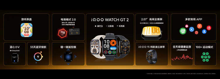 这款新品提供炽亮黑、星芒白、凌云三款配色,配备2.07英寸超亮全景屏,还配备iQOO 15同款凌云限量表带。此外,该产品还支持电竞模式2.0、33天蓝牙续航等。