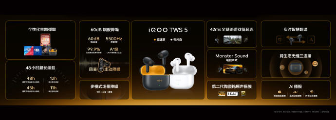 凤凰网科技讯 10月20日,iQOO TWS 5发布,该耳机拥有60dB降噪、42ms全链路游戏低延迟、Monster Sound电竞声效,售价399元。