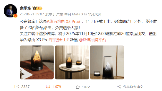 10月21日消息,华为常务董事、终端BG董事长余承东今日在微博上揭晓了此前其预热的新品的身份――华为路由X3Pro,将于11月正式上市。
