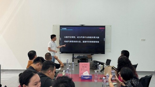 在新能源领域,元征展厅也有专门区域展示了相关诊断及动力电池包维保设备。由于媒体团中有不少新能源车主,大家对元征自2023年起推出的LAUNCH EVS新能源站表现出兴趣。LAUNCH EVS新能源站是元征以品牌技术赋能行业,助力维修厂扩展新能源维修业务的举措之一,反映出元征在新能源领域的布局。拥抱新能源,拥抱行业更多可能。 “AI智能维修大模型”成全场焦点,突破汽车维保时空限制 在展厅参观结束后,媒体团和元征代表共同参与了交流座谈会。会上, “AI智能维修大模型”成为热议焦点。作为技术代表,产品经理安海月先生以“元征AI――重构汽修服务新生态”为主题,分享了公司对于AI技术的发展蓝图。与此同时,蒋总进一步展示了即将上市的元征新品 “AI OBD”。