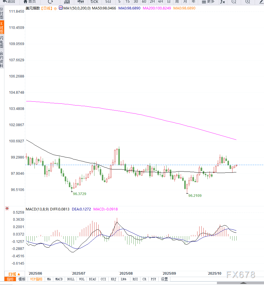 美元指数在本周亚洲时段继续承压,目前交投于约 98.60 附近。美国政府停摆已进入第 21 天,参议院多次未能达成资金方案,使市场对美元保持谨慎态度,整体风险偏好下降。 ![]() 尽管如此,市场对全球贸易担忧情绪缓和,提供了一定支撑。 分析师 Kyle Rodda 所言,“市场正在定价冲突将有所缓和,但在正式宣布前,市场仍可能保持紧张情绪。”市场重点关注即将公布的美国 9 月 CPI 数据,预计整体和核心 CPI 同比增幅约 3.1%。 若数据高于预期,短线可能支撑美元反弹。 日线图显示,DXY近期自 100.10 高点回落,连续三日下探支撑,当前价格位于 98.50–98.60 区间附近,接近 20 日移动均线。短期均线呈下行排列,RSI 指标约为 42,显示仍偏向空头,但未进入超卖区域。 若指数跌破 98.30 支撑,可能延伸至 98.00–97.80 区域;反之,若站稳 98.80–99.00 阻力,短线或出现反弹修正。整体日线形态显示短期空头占优,但有反弹机会,震荡偏弱格局明显。 ![]() 美元指数短线仍偏疲软,受政府停摆和美联储鸽派立场压制。关注 CPI 数据和政府停摆进展对短线波动的影响。若 CPI 超预期或全球贸易出现积极进展,美元可能出现临时反弹,但日线图形和技术指标显示,整体空头格局尚未改变,震荡偏弱仍是主要趋势。 |