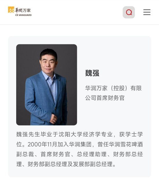 10月21日,华润万家官网显示,原华润啤酒副总裁、华润酒业总经理魏强已任华润万家(控股)有限公司首席财务官。 官网显示,魏强毕业于沈阳大学经济学专业,获学士学位。2000年11月加入华润集团,曾任华润雪花啤酒副总裁、首席财务官、总经理助理、财务部总经理、财务部副总经理及发展部副总经理。
