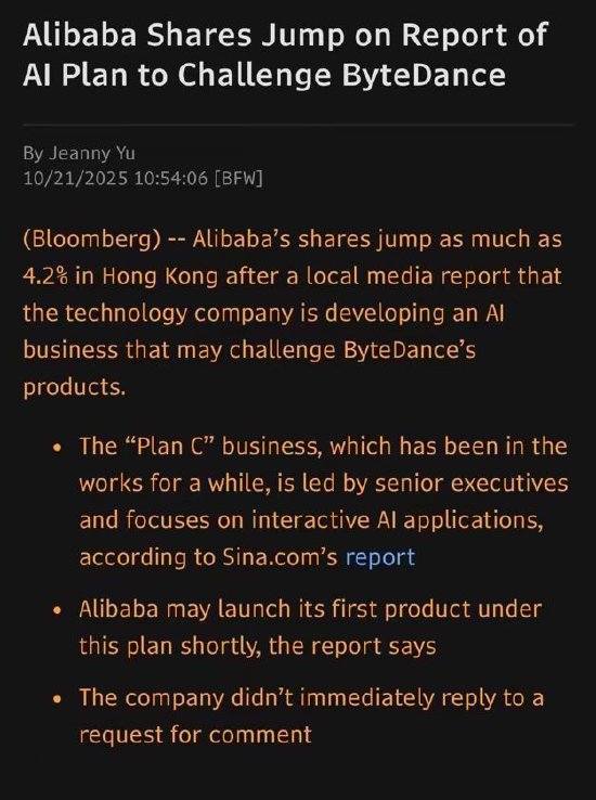 仟茂科技讯 10月21日上午消息,阿里巴巴香港股价今日涨逾4%,荣登港股人气榜第一,引发国内外广大投资群体关注。据彭博社报道,阿里巴巴旗下夸克正在开发一项AI业务,或将对字节跳动的产品构成挑战。 昨日晚间,仟茂科技独家获悉,这项被称为“C计划”(Plan C)的业务已经筹备了一段时间,由夸克核心团队牵头,通义实验室多位高级成员深度参与,重点方向聚焦在对话式AI应用领域。 据消息人士透露,阿里夸克可能会在近期推出该计划下的首款产品。 截至目前,阿里巴巴方面未回应置评请求。