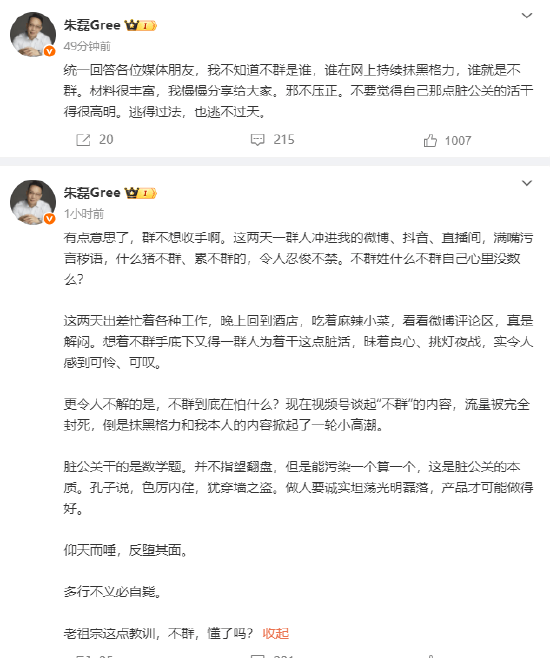 10月20日午间,珠海格力电器股份有限公司市场总监朱磊连发两条微博,就网络相关争议发声:直指 “不群” 或为抹黑力量,强调邪不压正。 朱磊首先表示,不清楚 “不群” 是谁,但明确指出,在网上持续抹黑格力的,就是 “不群”。他透露,自己掌握着丰富的相关材料,会慢慢分享给大家,坚信邪不压正。同时,他直言,不要觉得那些 “脏公关” 的手段有多高明,“逃得过法,也逃不过天”。 此前,朱磊还提到,这两天有一群人涌入他的微博、抖音、直播间,满口污言秽语,还出现 “猪不群”“累不群” 等说法,这让他 “忍俊不禁”。他质疑 “不群”,难道连自己在干什么都心里没数吗? 更让他不解的是,“不群” 到底在怕什么?他指出,现在视频号里谈起 “不群” 的内容,流量被完全封死,而抹黑格力和他本人的内容,却掀起了一轮小高潮。 朱磊认为,“脏公关” 做的是 “数学题”,其本质不是指望能 “翻盘”,而是 “能污染一个算一个”。他引用孔子 “色厉内荏,犹穿墙之盗” 的话,强调做人要诚实坦荡、光明磊落,这样产品才可能做好。最后,他以 “仰天而唾,反堕其面”“多行不义必自毙” 作结,反问 “不群”,老祖宗的这些教训,“懂了吗?” 关于朱磊文案中喊话的“群”,疑似暗指雷军近期的争议性称呼“雷不群”。