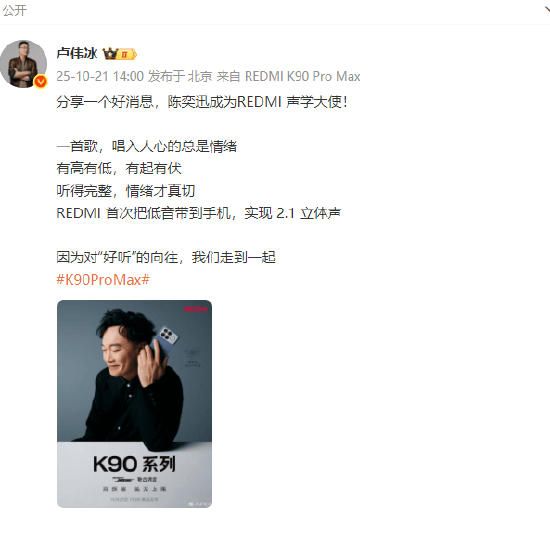 10月21日消息,今日小米集团合伙人、总裁,手机部总裁,小米品牌总经理卢伟冰在微博发文宣布,陈奕迅成为REDMI声学大使。
