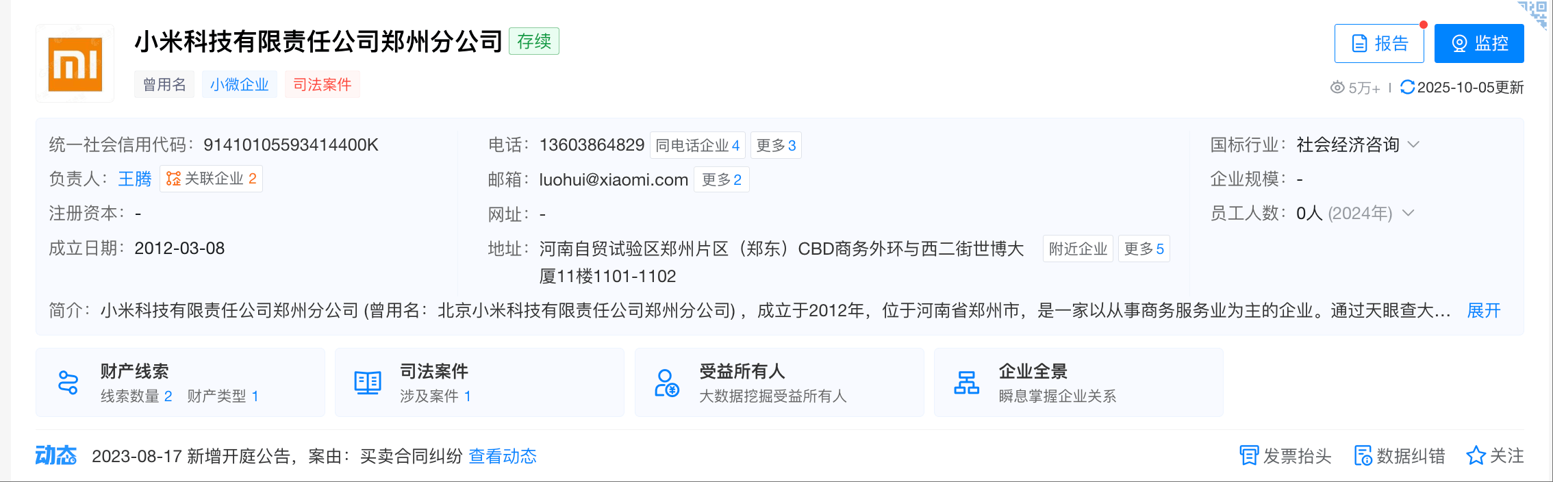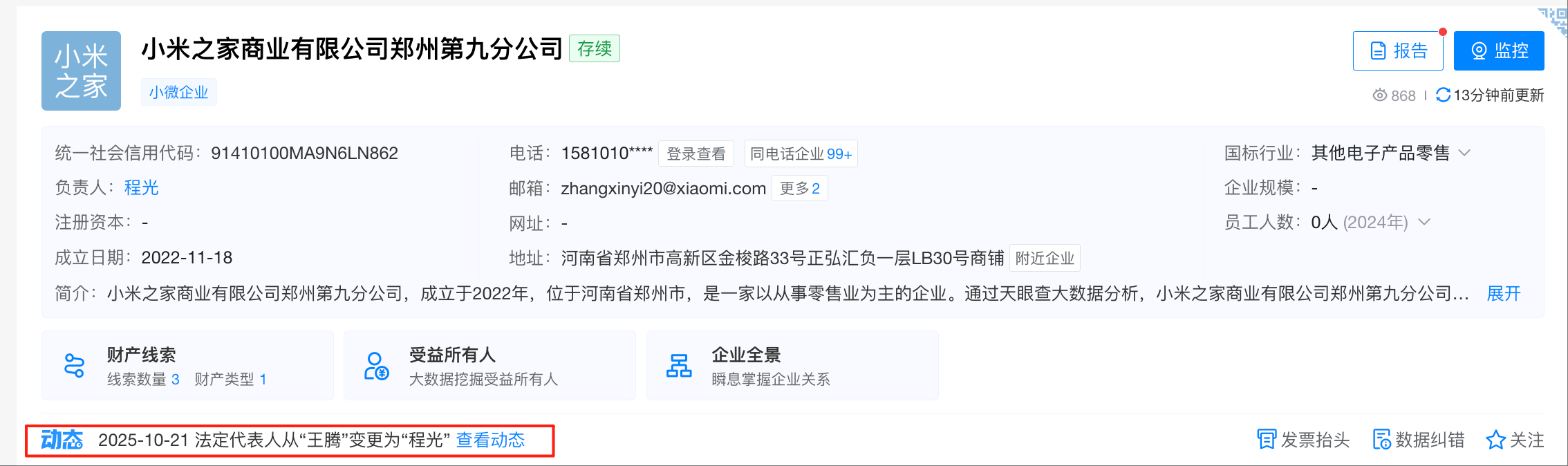 凤凰网科技讯 10月21日,天眼查显示,小米之家商业有限公司郑州第九分公司发生工商变更,王腾卸任该公司负责人,由程光接任。目前,王腾名下还关联1家小米科技有限责任公司郑州分公司。