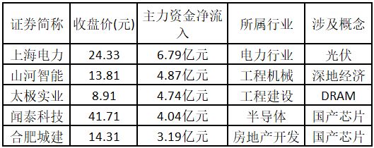 (注:创出近一年新高的涨停股,说明该股走出重要突破行情,值得重点关注。) 从主力资金来看,今日涨停板个股中,主力资金净流入金额排名前5的个股分别为上海电力、山河智能、太极实业、闻泰科技、合肥城建。