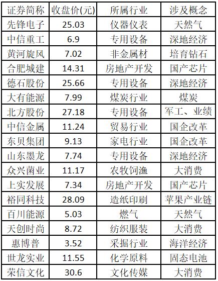 (注:创出历史新高的涨停股,说明该股人气旺盛、趋势明确,且上方无阻力,延续原上涨趋势概率较大。) 涨停板个股中,股价创出近一年新高的个股有18只(不包括创出历史新高的个股),包括先锋电子、中信重工、黄河旋风、合肥城建、德石股份、大有能源、北方股份、中信金属、东贝集团、山东墨龙、众兴菌业、上实发展、裕同科技、百川能源、天创时尚、惠博普、世龙实业、荣信文化,具体如下表所示。