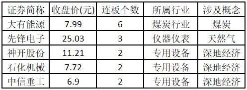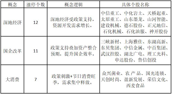 (注:行业涨停板个股越多,说明该行业被资金重点关注,是当前热门行业。) 从概念特征来看,今日涨停板个股中,深地经济、国企改革、大消费概念的个股最多。