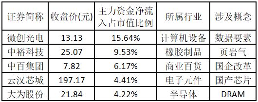 (注:主力资金净流入金额越多的涨停股,说明该股被主力资金重点关注,值得重点关注。) 主力资金净流入金额占市值比例排名前5的个股分别为微创光电、中裕科技、中百集团、云汉芯城、大为股份。