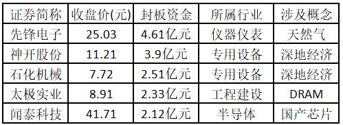(注:主力资金净流入金额占市值比例越高的个股,说明该股被主力资金重点关注,值得重点关注。) 从封板资金来看,今日涨停板个股中,封板资金排名前5的个股包括先锋电子、神开股份、石化机械、太极实业、闻泰科技。欢迎大家关注微信公众号“道达号”,其“道达涨停复盘”栏目为大家解读。
