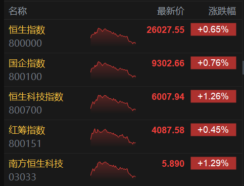 格隆汇10月21日|港股三大指数午后涨幅稍有收窄,总体仍维持上涨格局,同时延续昨日反弹行情,市场情绪持续回暖。截止收盘,恒生指数涨0.65%重回26000点上方,国企指数涨0.76%,恒生科技指数涨1.26%报6007点。