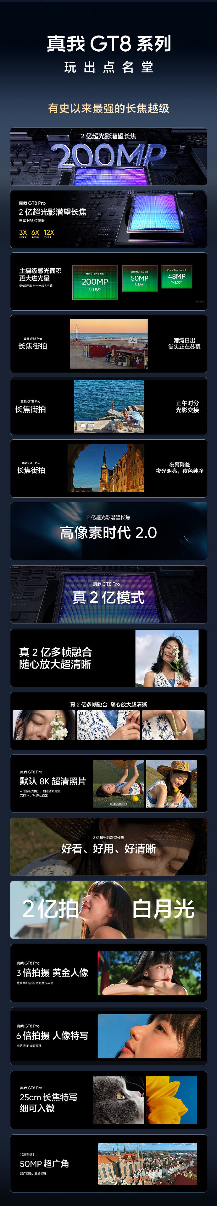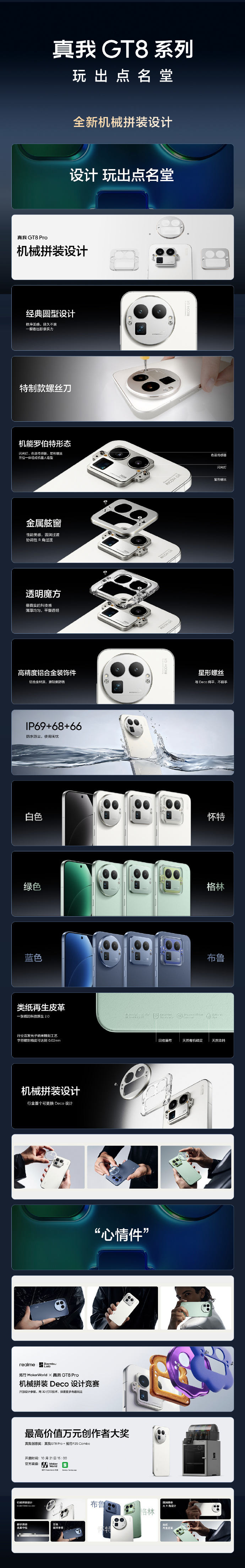 影像系统是此次新机的重点。真我GT8 Pro深度联合理光GR相机,提供了包括经典28mm和40mm焦段、沉浸式取景器、快拍对焦等定制化拍摄模式。同时,内置了高对比黑白、正片、负片等五款理光GR经典胶片影调滤镜,旨在还原GR系列的标志性成像风格。硬件上,主摄采用了理光GR防眩光技术,通过多层镀膜工艺提升透光率并抑制眩光。 长焦方面,其搭载的2亿像素潜望长焦镜头支持3倍光学变焦、6倍无损变焦以及最近25cm的特写拍摄,并支持8K格式照片录制。 新机提供了“怀特”、“布鲁”、“格林”三款配色,其中两款采用类纸再生皮革材质。