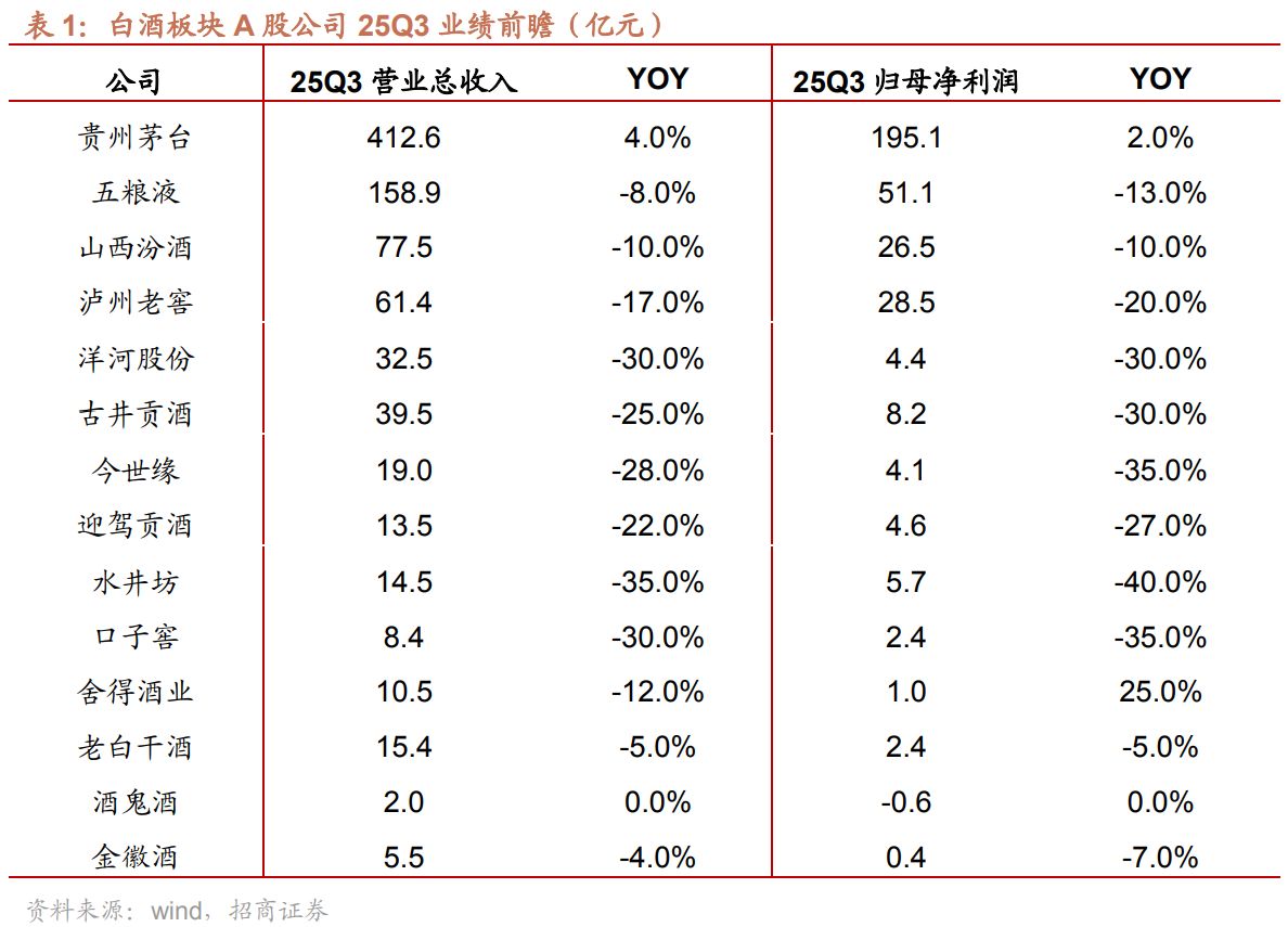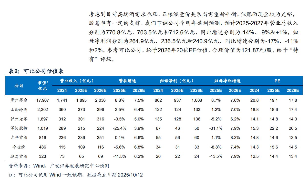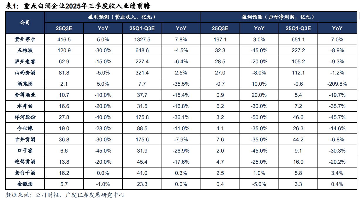 每经记者|刘明涛 每经编辑|肖芮冬 近期,一份广发证券关于白酒2025年三季报业绩前瞻的研报在白酒圈激起千层浪。该份研报预测,白酒巨头五粮液三季度营收可能同比下滑30%、净利润同比下滑45%。 值得关注的是,上述预测数据与申万、国信等多家头部券商的预测数据相去甚远。 那么,广发证券关于五粮液净利润的预测依据到底是什么?为什么会抛出“五粮液与泸州老窖‘易位’”的观点?《每日经济新闻·将进酒》记者对此展开了调查分析。 广发证券预测:五粮液三季度净利润下滑45%上周,广发证券发布《白酒持续调整,大众品表现分化——2025年三季报业绩前瞻》研报,对白酒上市公司三季度业绩进行了详细预测分析。总体来看,广发证券认为,步入8月后,随着政策在执行层面的规范与完善,白酒需求环比有所改善,但同比仍承压。从经销商回款进度看,预计厂商博弈下,多数厂家放松回款要求/不再强制性要求打款,部分头部酒企表现相对较优。 鉴于此,该券商预计2025年三季度白酒企业表端业绩将进一步向实际动销收敛。分价格带看,预计高端酒中,贵州茅台有望展现强韧性;次高端商务需求仍弱,汾酒优势领先;地产酒龙头持续调整。