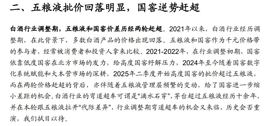 对于券商的季报预测数据,《每日经济新闻·将进酒》记者以投资者身份致电五粮液证券部。该公司证券部工作人员回应称:“今年国庆中秋双节的动销与往年相比,确实要平淡一些,但是(目前)没法给一个定量的数据。至于券商的季报预测,每个券商的调研数据不同,得出的结论肯定也不同。(对此)公司没办法去澄清,因为澄清回应券商预测就会涉及内幕信息泄露,所以业绩数据可以等我们三季报发布。” 抛出“五粮液、泸州老窖‘易位’”的观点与此同时,广发证券还发布了题为《五粮液(000858.SZ)量价需再平衡,下调今明年盈利预测》的研报。在这份研报中,广发证券更是抛出了“五粮液、泸州老窖‘易位’”的观点。