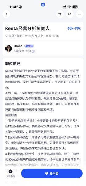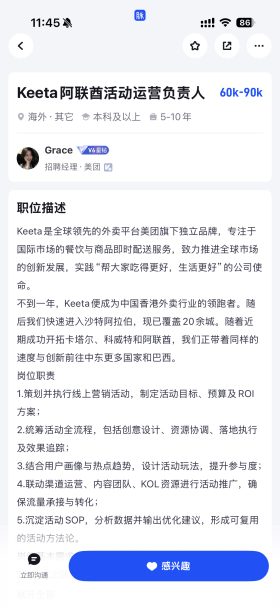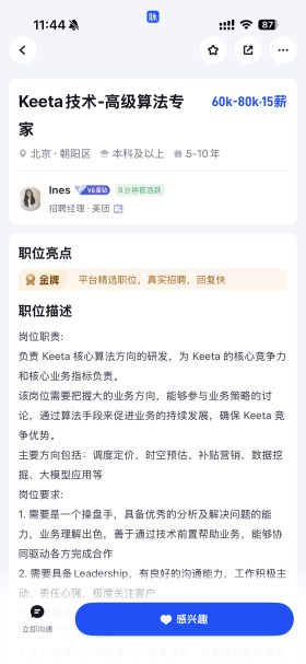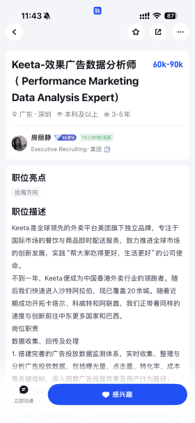凤凰网科技讯 10月21日,美团近期在出海业务上动作频频。10月20日,公司宣布软硬件服务负责人肖飞与Keeta业务负责人仇广宇新晋加入S-team,这一最高管理层的调整被业界视为其加速国际化布局的明确信号。 与此同时,美团旗下海外品牌Keeta正大力扩充团队,在职场社交平台脉脉上释放多个高薪职位。招聘信息显示,岗位包括月薪最高达9万元的数据分析师、阿联酋活动运营负责人,以及年薪120万元的高级算法专家等。相关人力资源负责人亦保持高频更新,持续吸引人才加入。
