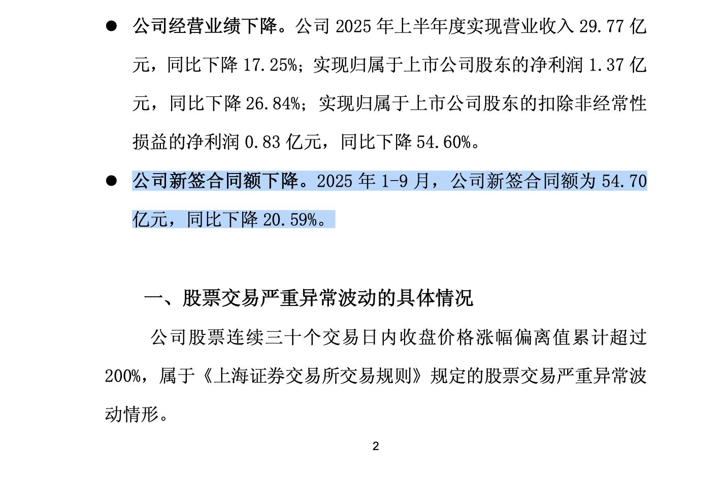 10月21日晚间,华建集团再度披露股票交易严重异常波动公告称,经自查,并书面询证控股股东上海国有资本投资有限公司(下称“上海国投公司”),截至上海国投公司回函出具日(2025年10月21日),公司及上海国投公司不存在可能对公司股价产生较大影响的涉及公司的应披露而未披露的重大信息,无正在筹划的涉及公司的重大资产重组、股份发行、收购、债务重组、业务重组、资产剥离、资产注入、股份回购、股权激励、破产重整、重大业务合作、引进战略投资者等重大事项。 华建集团提示:前三季度新签合同额同比下降20.59%。