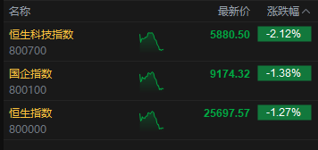 10月22日消息,港股三大指数集体下跌。截至午间收盘,恒生指数跌1.27%,报25697.57点,恒生科技指数跌2.12%,国企指数跌1.38%。盘面上,科网股全线下跌,网易跌超5%,联想、快手、百度、阿里巴巴、哔哩哔哩跌超2%,京东、小米、腾讯跌超1%;黄金股大跌,山东黄金(600547)跌超3%;创新药概念高开低走,百济神州跌超3%;新消费概念走弱,老铺黄金跌超7%;广和通(300638)上市首日跌超7%。
