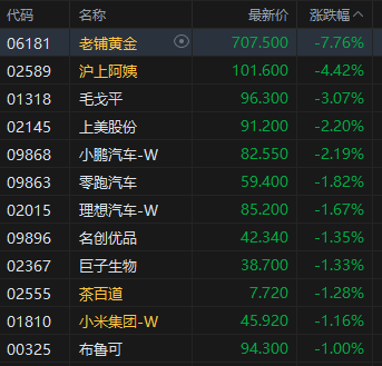 新消费概念走弱,老铺黄金跌超7%。老铺黄金公布,拟配售371.18万股新H股,每股作价732.49港元,较上一交易日收盘价767盘元折让约4.5%,所得款项净额为约27.07亿港元,拟用于以下用途:70%用于存货储备;10%用于门店拓展及现有门店位置优化和面积扩建;20%用于补充流动资金及一般企业用途。