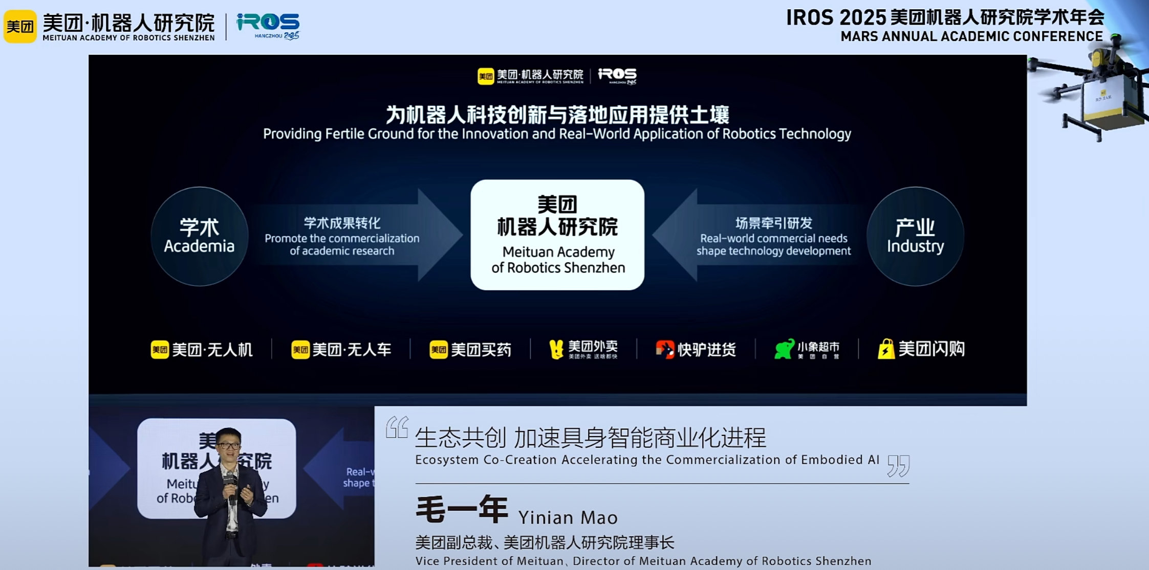 每经记者|赵雯琪 每经编辑|董兴生 在全球智能机器人与系统大会(IROS)时隔19年重返中国内地之际,美团于10月20日举办了一场备受瞩目的机器人学术年会。 《每日经济新闻》记者了解到,美团副总裁、美团机器人研究院理事长毛一年在现场系统阐述了美团在无人机、无人车、仿人灵巧手等方向的技术突破与规模化落地进展。毛一年提到,美团的战略在前几年升级到“零售+科技”。在他看来,零售是舞台,科技是让这个舞台更大、更高效、服务更好的工具。同时,零售业务产生的收入,也为前沿科技的长期投入提供了宝贵的资金。 更引人关注的是,年会现场,宇树科技创始人王兴兴、自变量机器人CEO王潜和星海图智能联合创始人许华哲等美团投资过的具身智能企业代表集体亮相,与美团同台探讨商业化路径。 这一阵容释放出明确信号:美团正在通过“资本+技术+场景”的生态化布局,抢占具身智能赛道先机。也预示着,在阿里、京东、字节跳动等巨头纷纷入局的背景下,具身智能的竞争已从技术单点突破进入生态体系构建的新阶段。