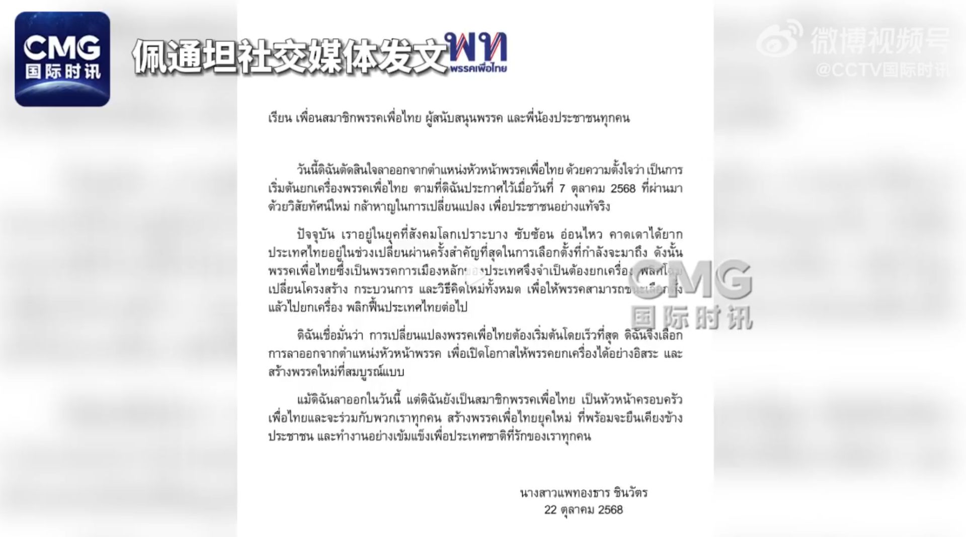 每经编辑|张锦河 据新华社,泰国前总理佩通坦10月22日在社交媒体上发文,宣布辞去为泰党党首职务。 佩通坦说,她决定辞去为泰党党首职务,希望以此作为重启为泰党的起点。泰国正迎来一次最为关键的转型期,特别是即将到来的大选。她说,为泰党需要对其组织架构、运作流程和思维模式进行彻底改革。因此,她选择辞去党首职务,以便该党能够独立进行改革,打造一个全新的、更加完善的政党。 佩通坦还表示,辞任党首后,她仍是为泰党党员。