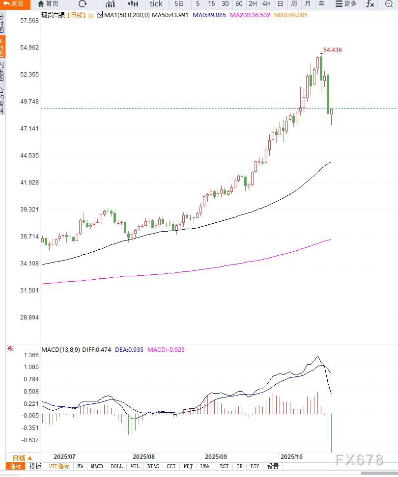 白银在周三亚洲时段自两周低位反弹至约49美元,此前受全球贸易预期改善影响,自上周五以来累计下跌近12%。 ![]() 政策面方面,美联储几乎确定将在下周降息,这对无收益资产如白银形成利好。投资者在此之前将关注推迟发布的美国9月消费者价格指数(CPI)数据,以评估降息节奏及通胀态势。 白银价格自上周五历史高点54.50美元回落,近期趋势呈不确定状态。20日指数移动平均线(EMA)位于约49.04美元,价格难以重返上方,显示短期多头动能受阻。 14日相对强弱指数(RSI)低于60,表明上涨势头暂时终止。 下方支撑位关注近期低点47.53美元、10月2日低点45.90美元及9月25日低点43.78美元;若突破这些支撑,白银可能进一步承压。 上方阻力关注10月21日高点52.71美元及历史高点54.50美元,突破将重新点燃多头动能。 在4小时级别上,白银呈整理偏弱格局,价格在48.50–49.50美元区间内震荡,短期均线略呈下行,MACD柱体收缩,RSI位于50附近,显示短线调整仍在继续,关键关注区间边界突破带来的方向信号。 ![]() 白银短线自低位反弹,但多头动能受阻,技术面显示整理偏弱。政策面上,美联储降息预期为白银提供中期支撑,贸易不确定性仍可能引发避险资金流入。关注47.53美元支撑位的稳固情况,以及突破52.71美元阻力的潜在反弹机会。 |