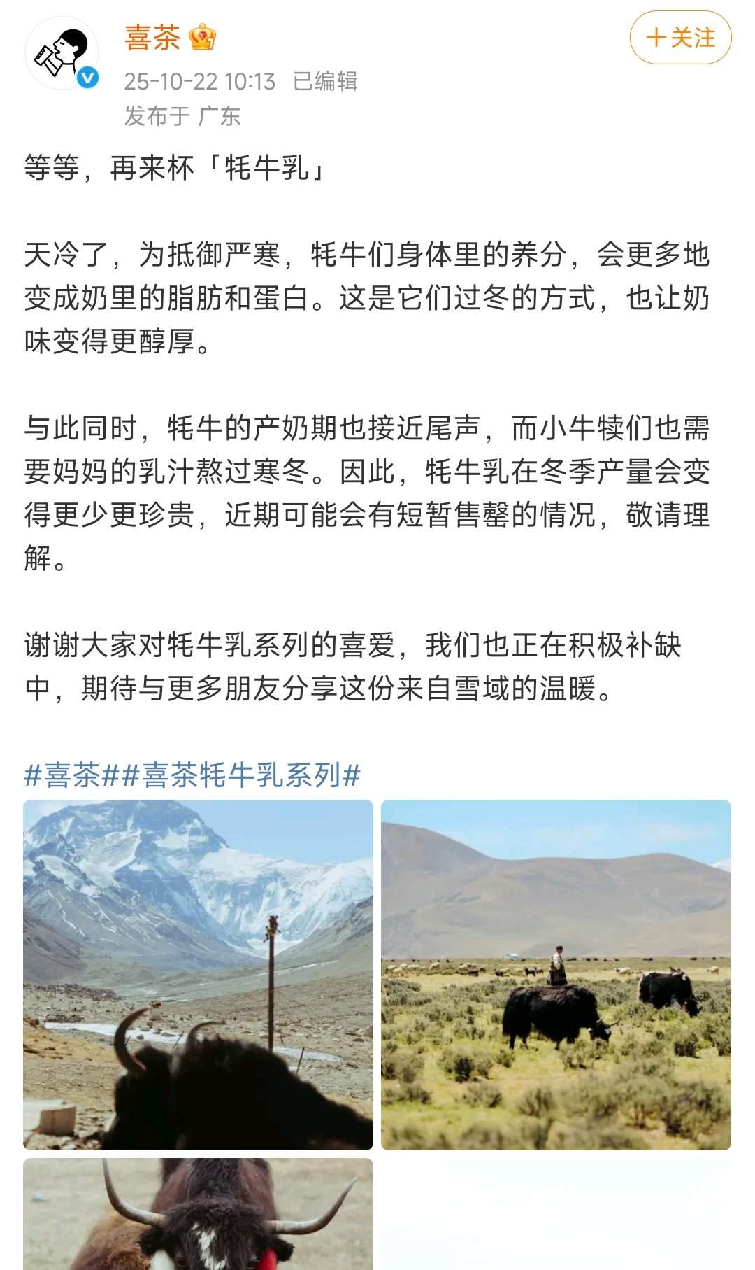 10月22日,近日,有多位网友发现喜茶不久前刚回归的人气产品“雪域・牦牛乳恰安莫”,在上架10日后陆续出现售罄情况,北京、天津、青岛、济南、西安、沈阳、上海等城市不少门店内均已显示临时下架。对于上述情况,喜茶官方表示:原料牦牛乳冬季产量变化,近期可能会有短暂售罄的情况,目前正在积极补货中。 据悉,“雪域・牦牛乳恰安莫”于2024年9月首次在西藏地区门店上线,受到广泛关注。今年5月、10月,“雪域・牦牛乳恰安莫”先后两次回归全国热销。公开信息显示,牦牛乳作为该款产品原料,必须先经过风味测试,再通过各项严格的品质指标检测,喜茶还需要前往奶源产地和生产工厂进行实地考察及审查,确保奶源品质符合喜茶要求。